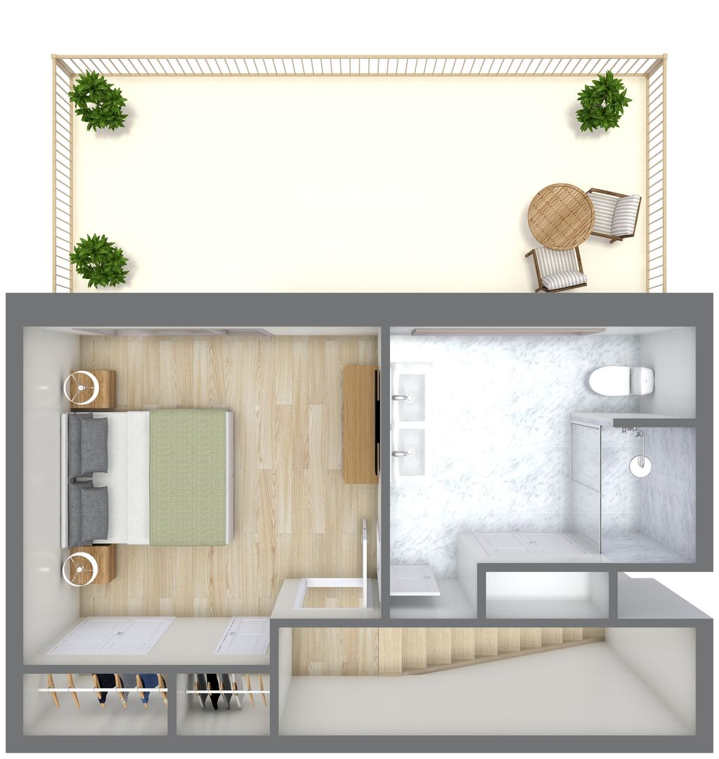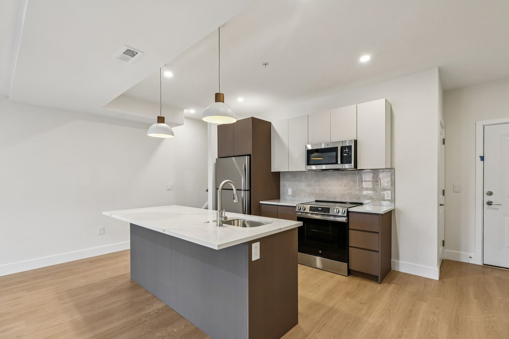 Welcome to the Penthouse at The Bellmere – Be the first to reside in this newly developed two-bedroom two-bathroom residence presenting a private roof deck, bi-level layout, and beautifully sunlit interiors. With its curated design and tailored finishes, the residence delivers timeless two-tone walnut and ivory kitchen cabinetry and a ten-foot kitchen island lined with Pilazzo Gold quartz countertops. The kitchen showcases a full set of stainless-steel appliances and opens into a large living room with floor-to-ceiling windows. Several units in this collection also feature an additional den space.