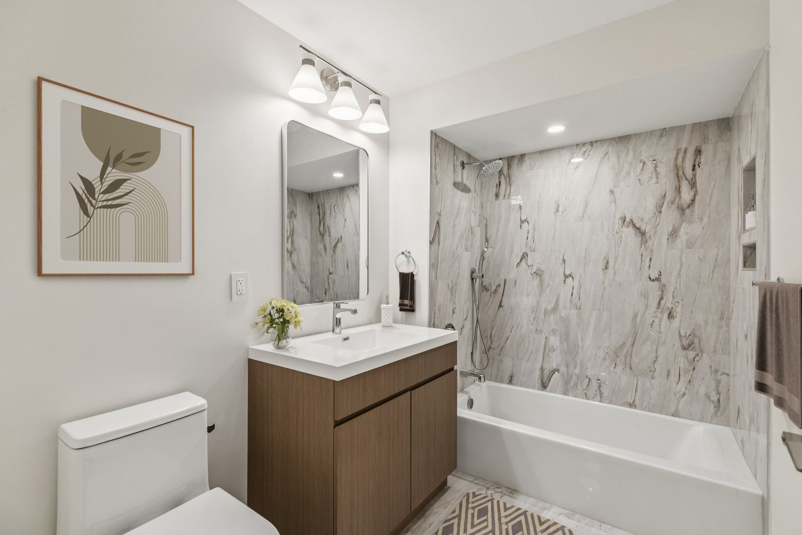 The primary bedroom suite features a luxurious private bath with Calacatta Gold-veined tile finishes, a brushed natural oak toned vanity and spacious standing shower. The second full bathroom showcases a bathtub with polished regal tile finishes and brushed grey oak toned vanity. Both bathrooms are adorned with an overhead showerhead and handheld shower providing ease of use and the luxury of a spa-like rain shower.