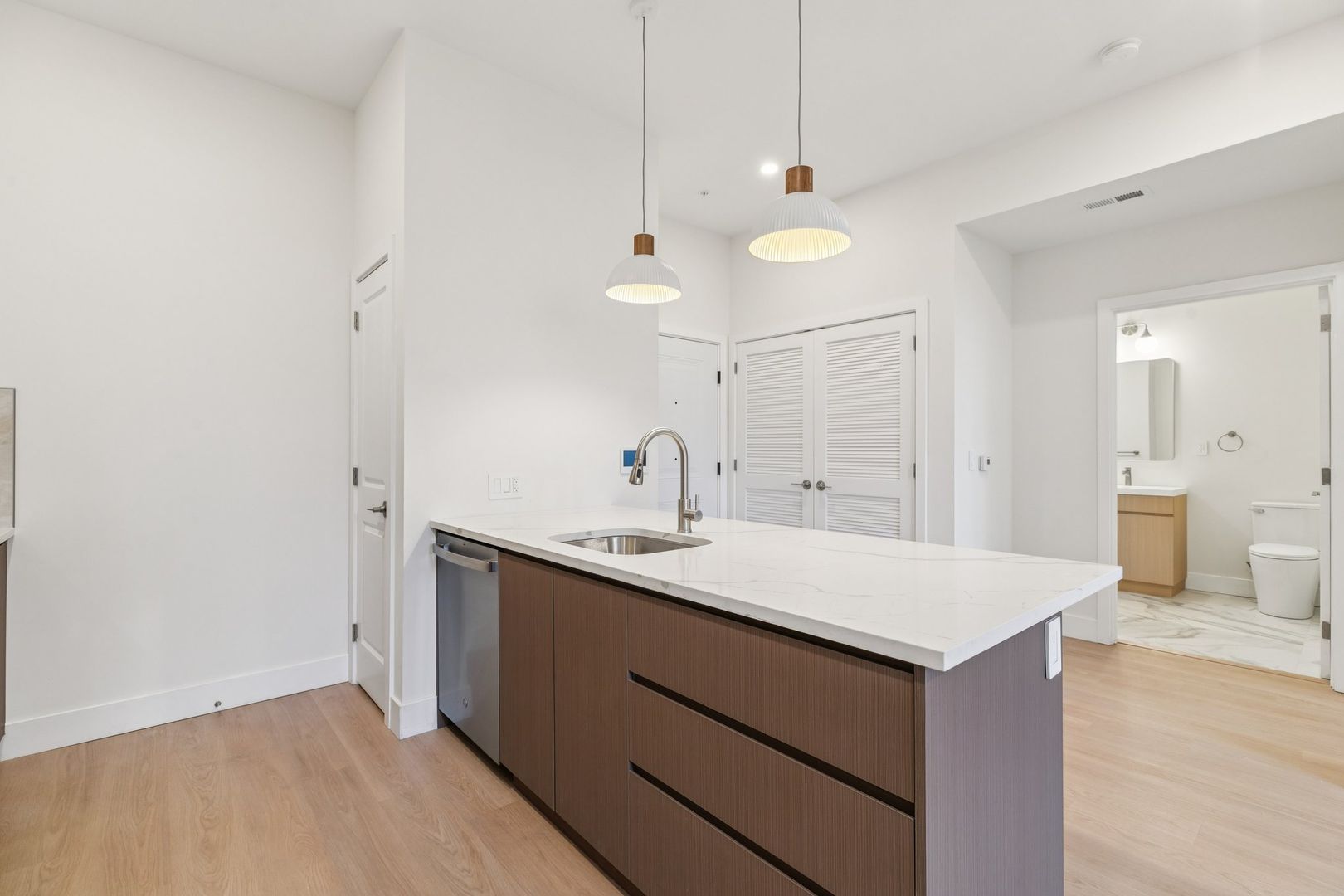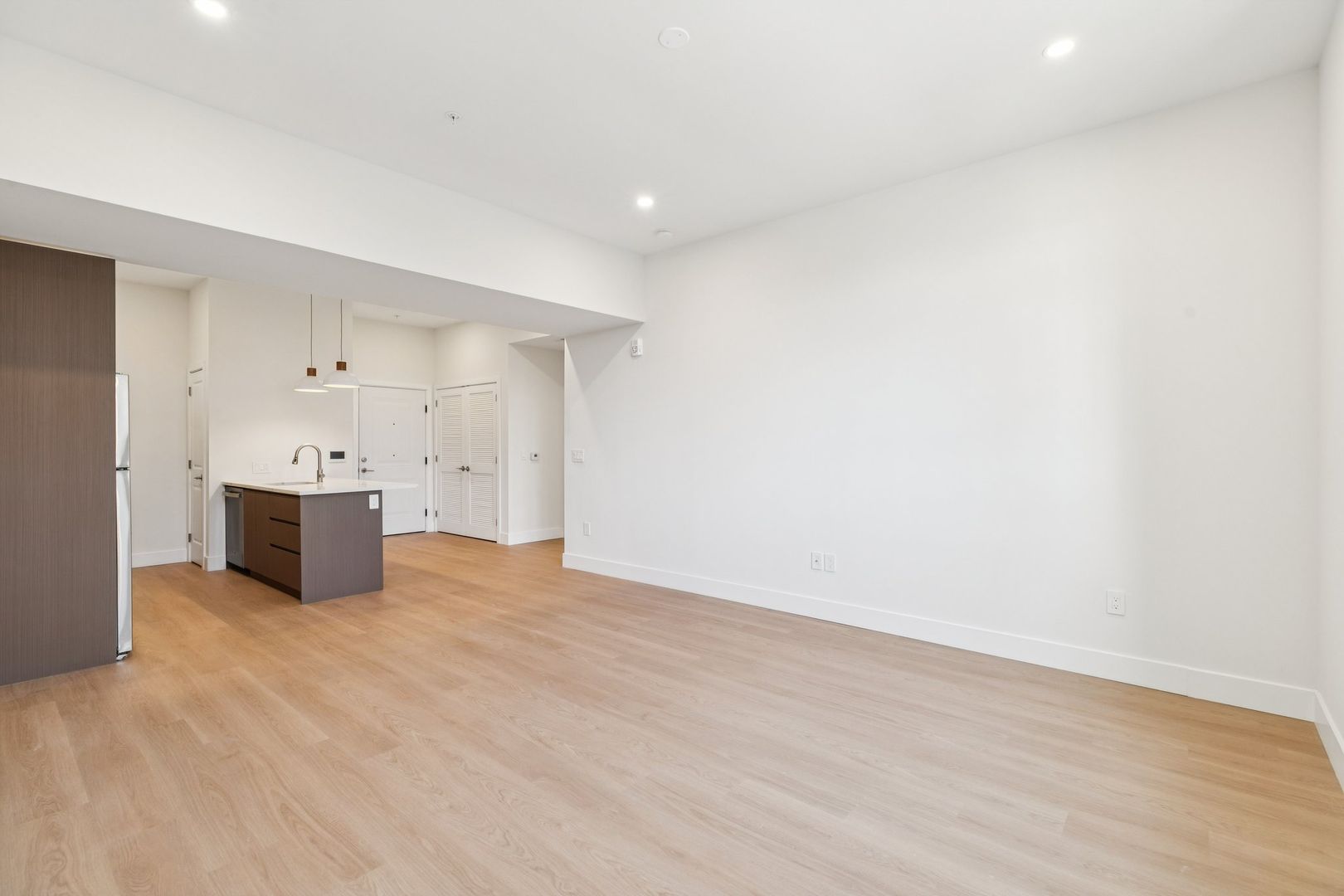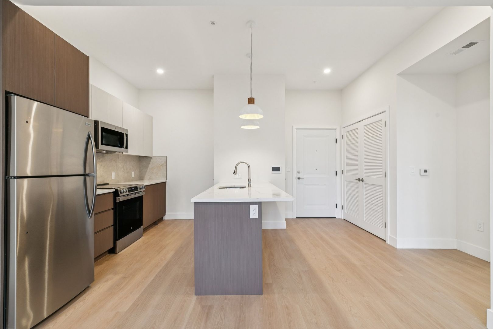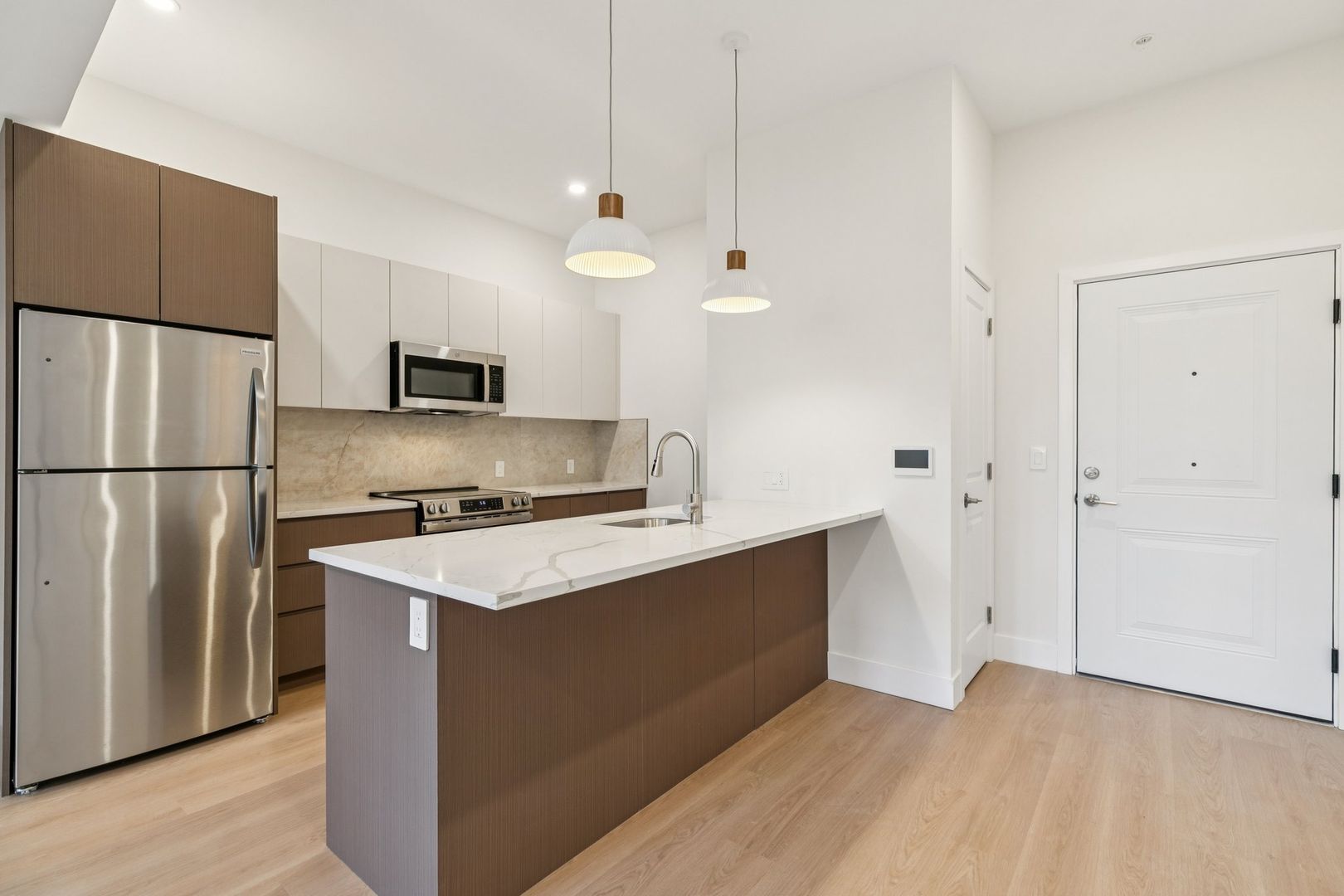 Welcome to the Monroe at The Bellmere – Be the first to reside in this newly developed one-bedroom one-bathroom residence presenting an open layout, organic finishes, and beautifully sunlit interiors. With its curated design and tailored finishes, the residence delivers timeless two-tone walnut and ivory kitchen cabinetry and a seven-foot kitchen island lined with Pilazzo Gold quartz countertops. The kitchen showcases stainless-steel appliances, a pantry closet for additional storage needs, and opens into a large living room with architectural and grand windows.