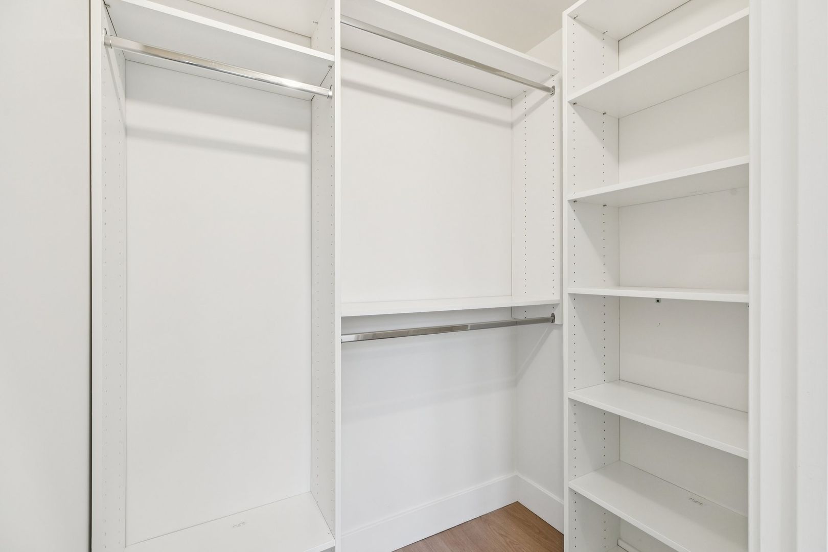 The bedroom suite features a custom closet and a luxurious private bath with Calacatta Gold-veined tile finishes, a brushed natural oak toned double vanity and spacious standing shower. The bathroom is adorned with an overhead showerhead and handheld shower providing ease of use and the luxury of a spa-like rain shower.