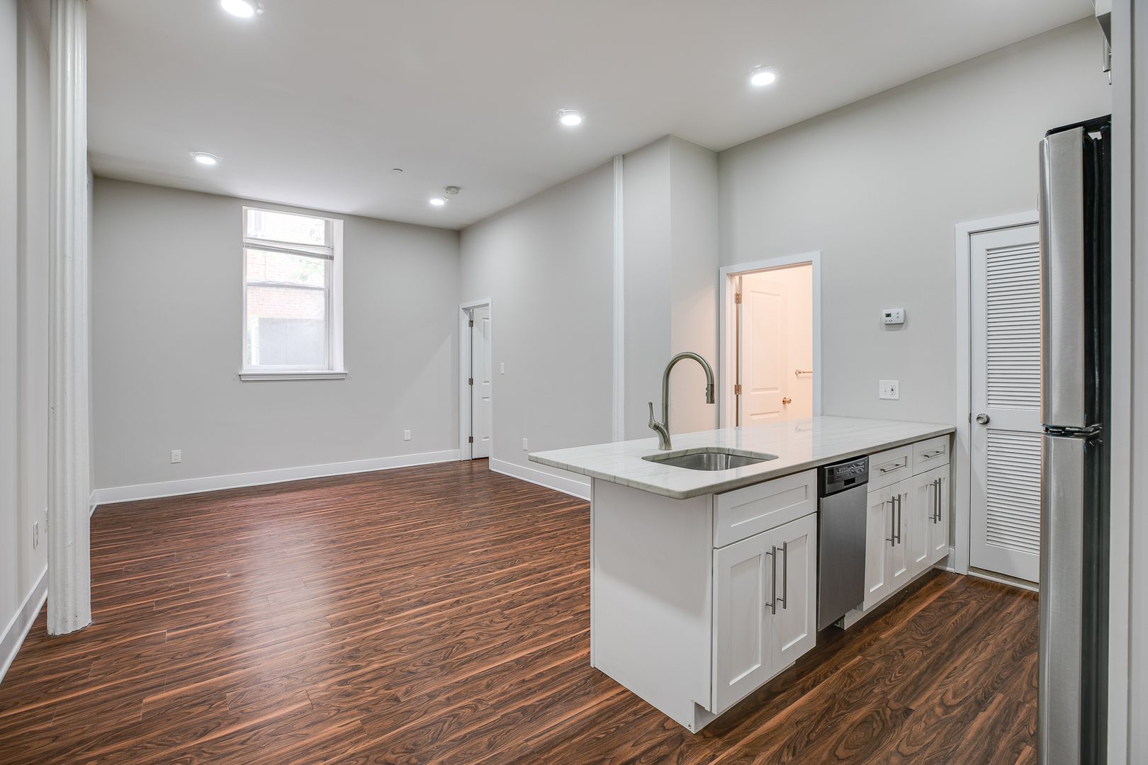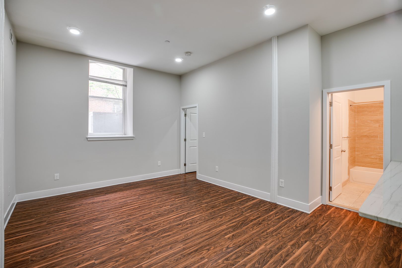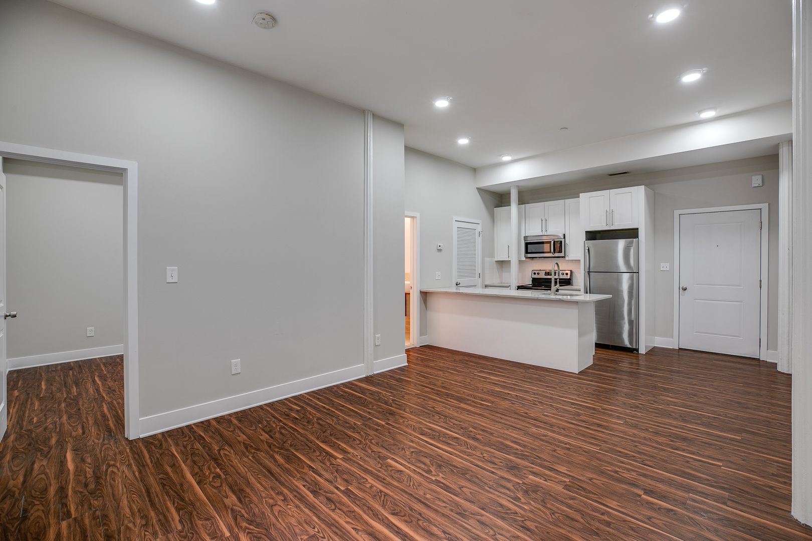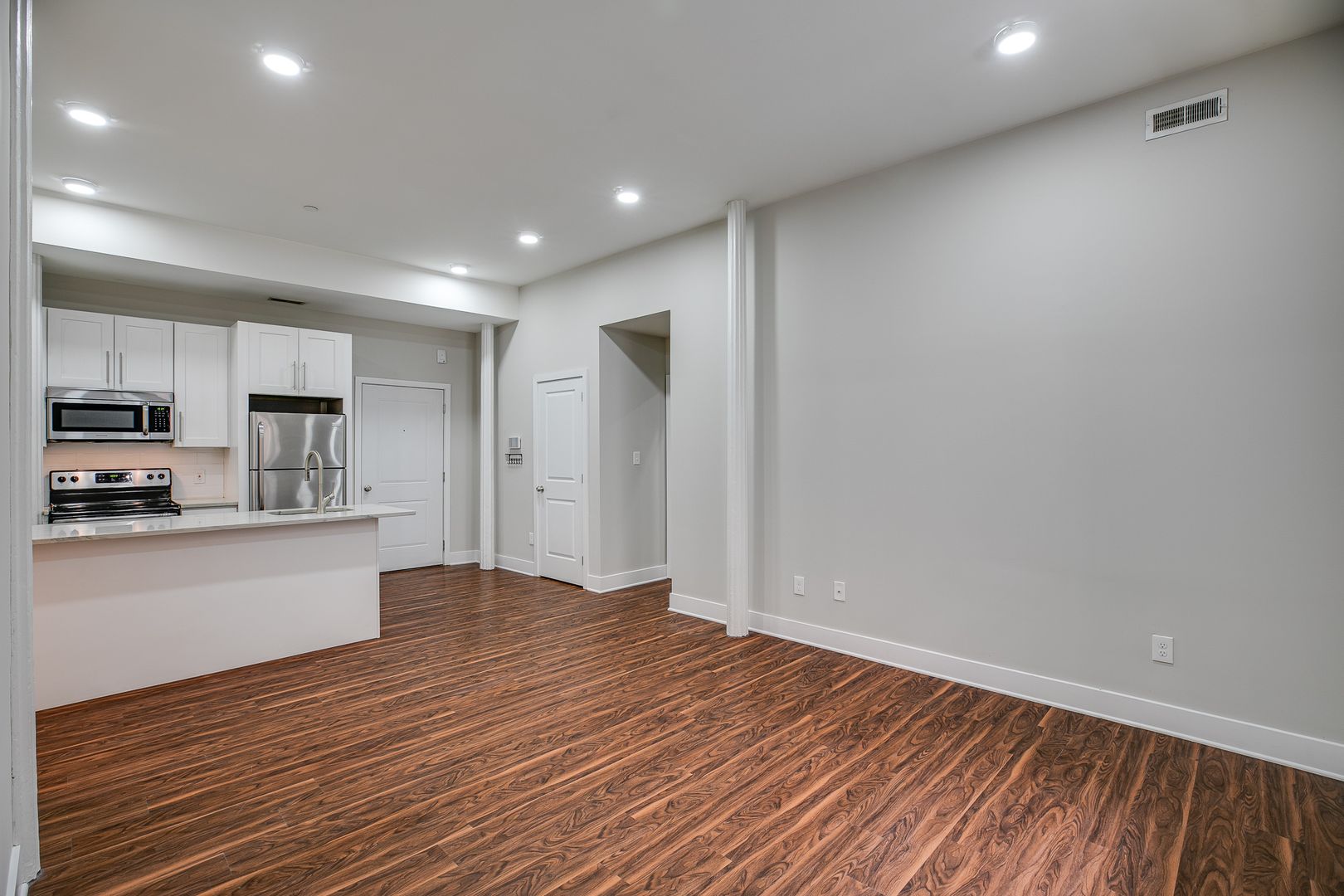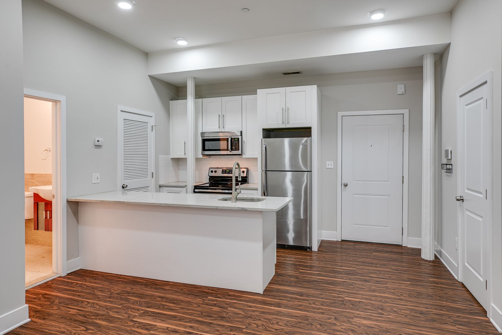 Step inside this two-bedroom two-bathroom unit to be met with an open floor layout featuring an eat-in kitchen with Bethel White granite countertops and stainless-steel appliances lined with white subway tile. These features are further accentuated by high ceilings and salsa wood-toned flooring. Both bedrooms provide ample room for a dresser, nightstand, desk, and any other additional accessories. One of the bedrooms offers a walk-in-closet. After dusk, there is no need to reach for your floor lamp as this unit has recessed lighting throughout.