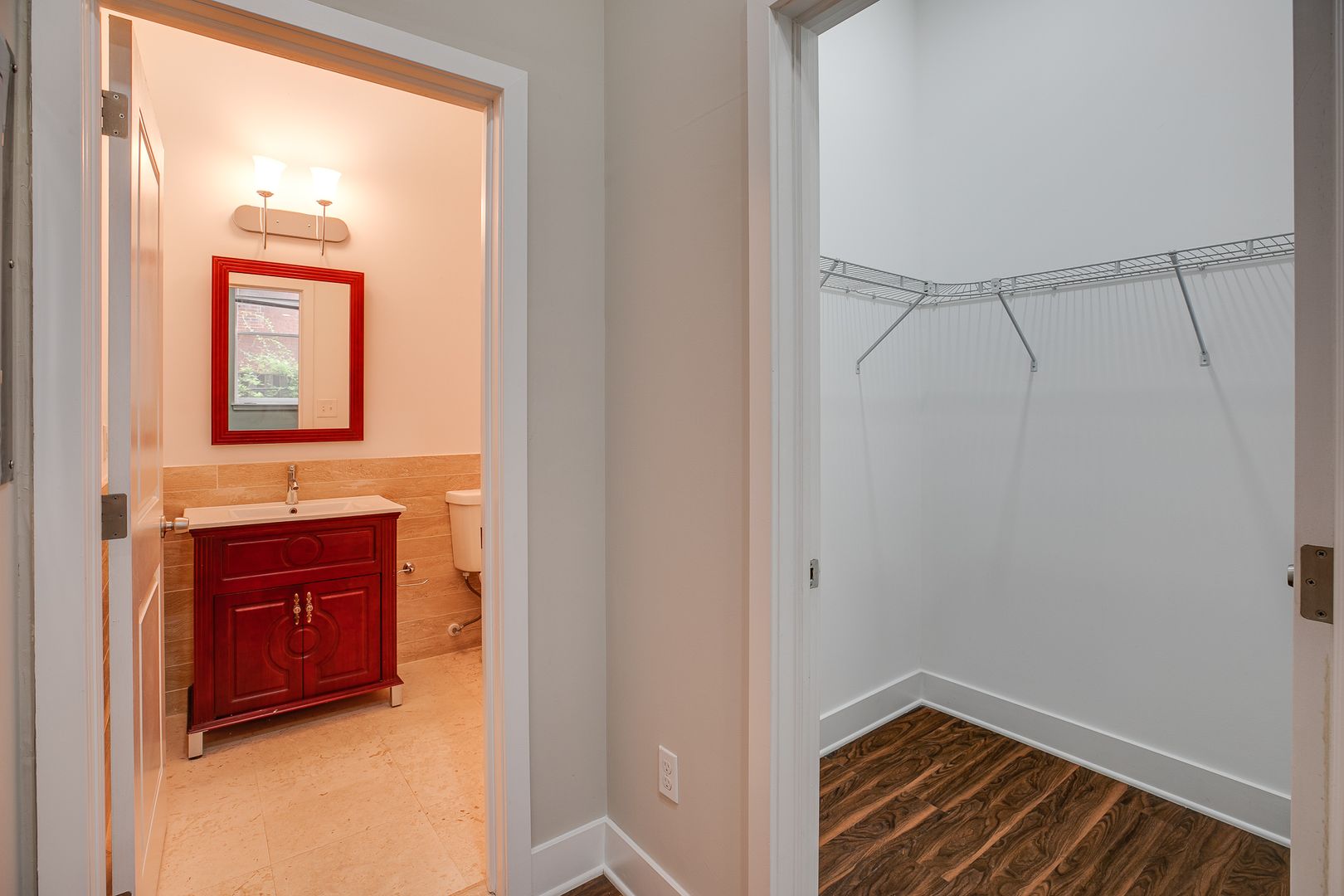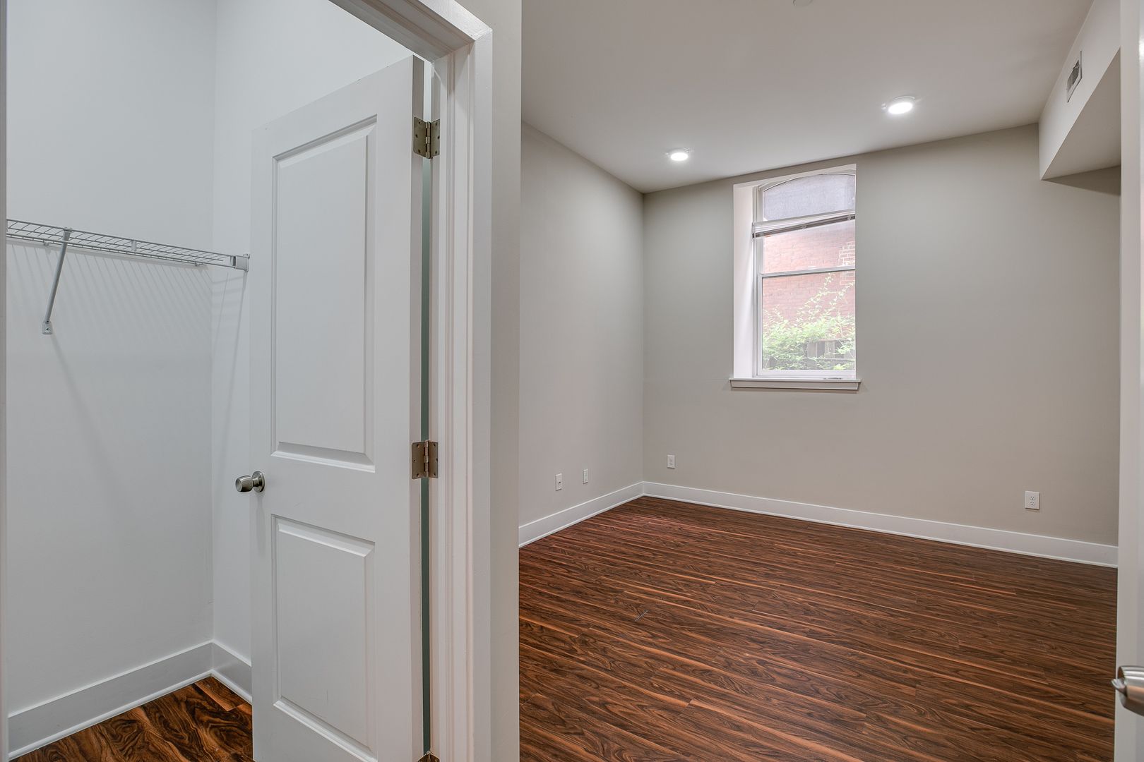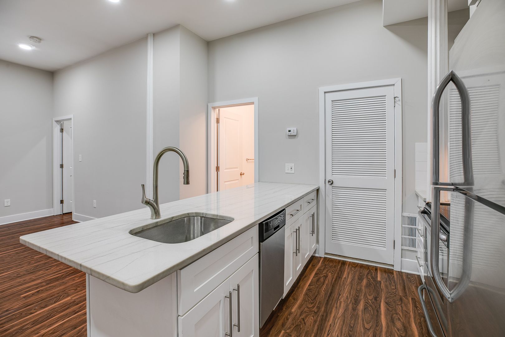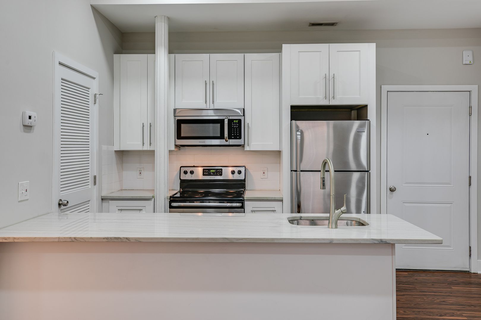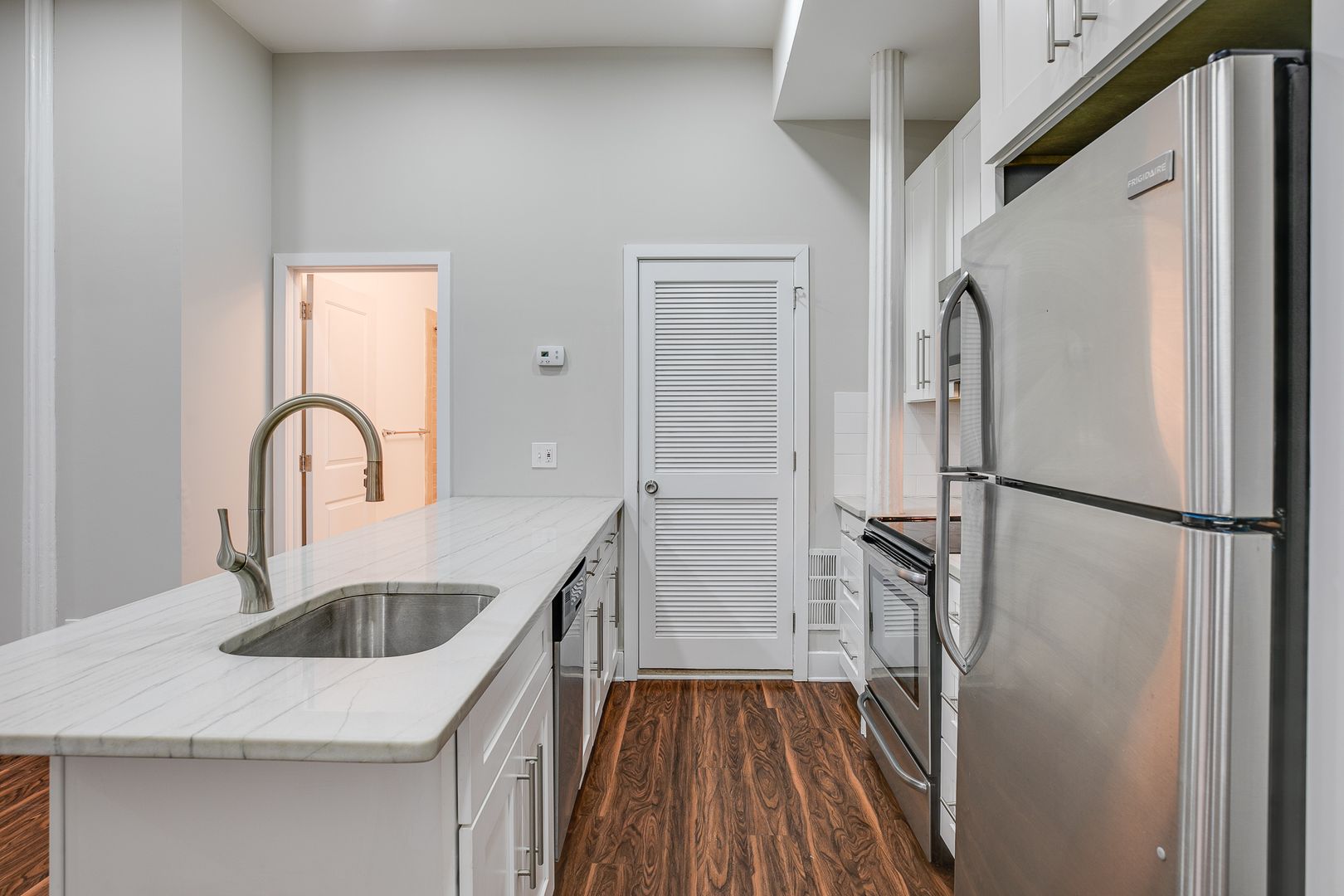 Step inside this two-bedroom two-bathroom unit to be met with an open floor layout featuring an eat-in kitchen with Bethel White granite countertops and stainless-steel appliances lined with white subway tile. These features are further accentuated by high ceilings and salsa wood-toned flooring. Both bedrooms provide ample room for a dresser, nightstand, desk, and any other additional accessories. One of the bedrooms offers a walk-in-closet. After dusk, there is no need to reach for your floor lamp as this unit has recessed lighting throughout.