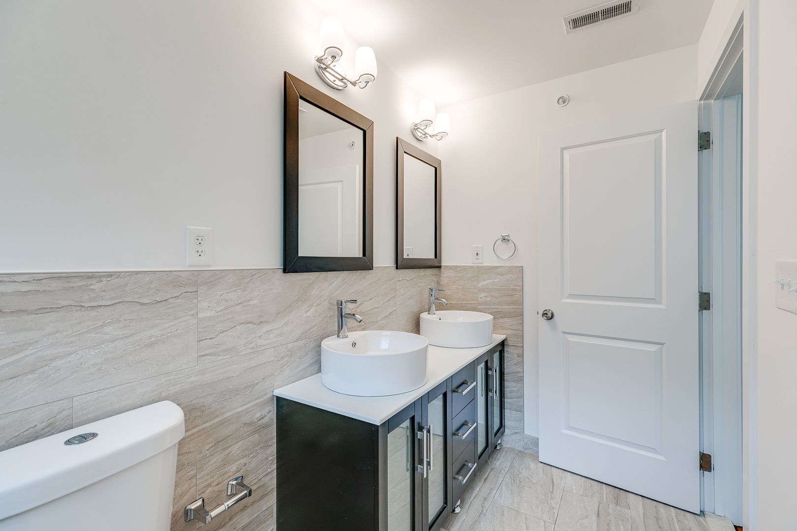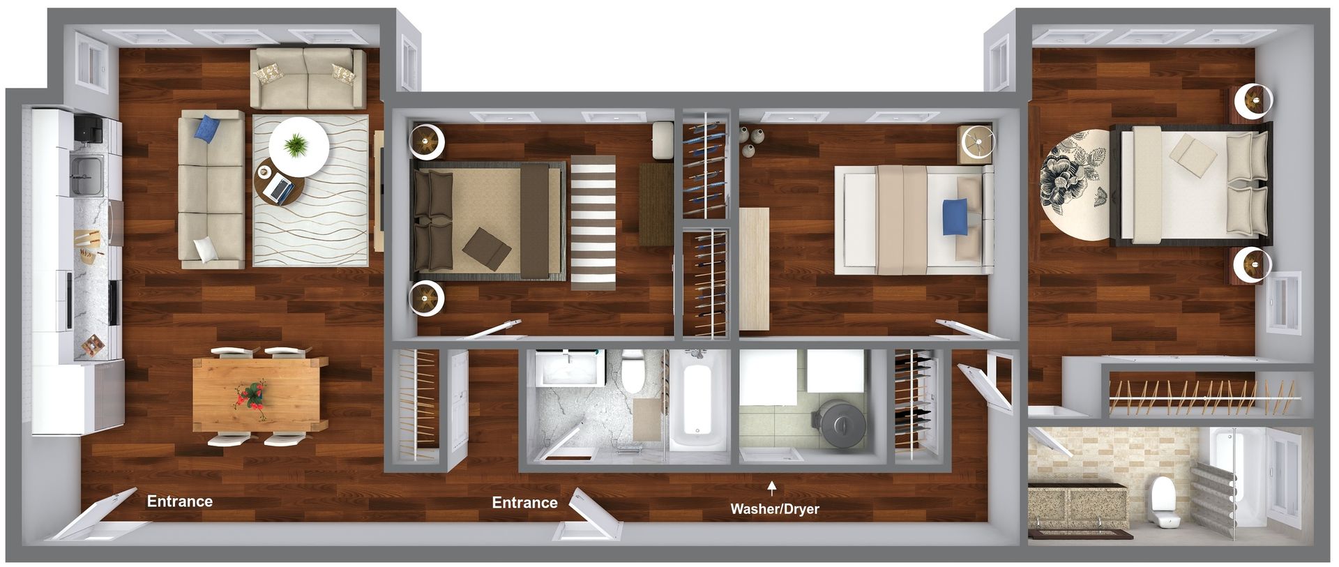 Both bathrooms are lined with stone-toned tile, with one of the bathrooms featuring a double-sink vanity. For comfortable living, this unit has a central AC system, an in-unit washer/dryer, as well as a video intercom system to let your guests in and communicate with delivery services. To schedule a tour, further inquire, or apply for the unit, do not hesitate to reach out!