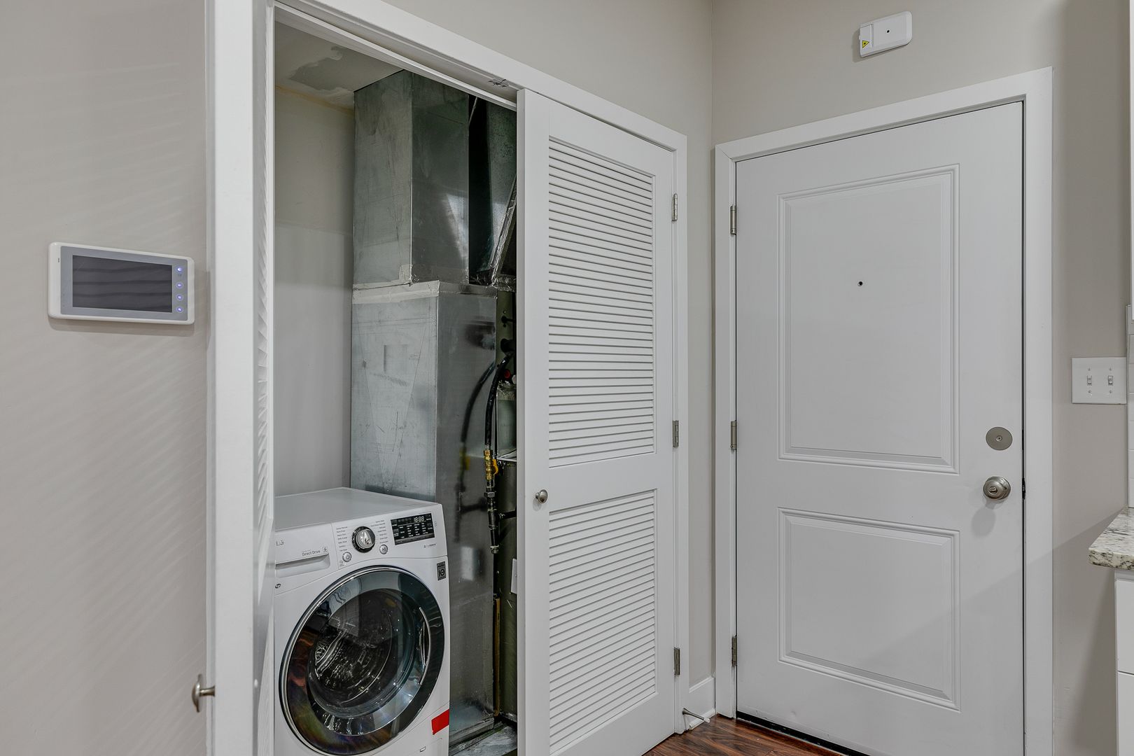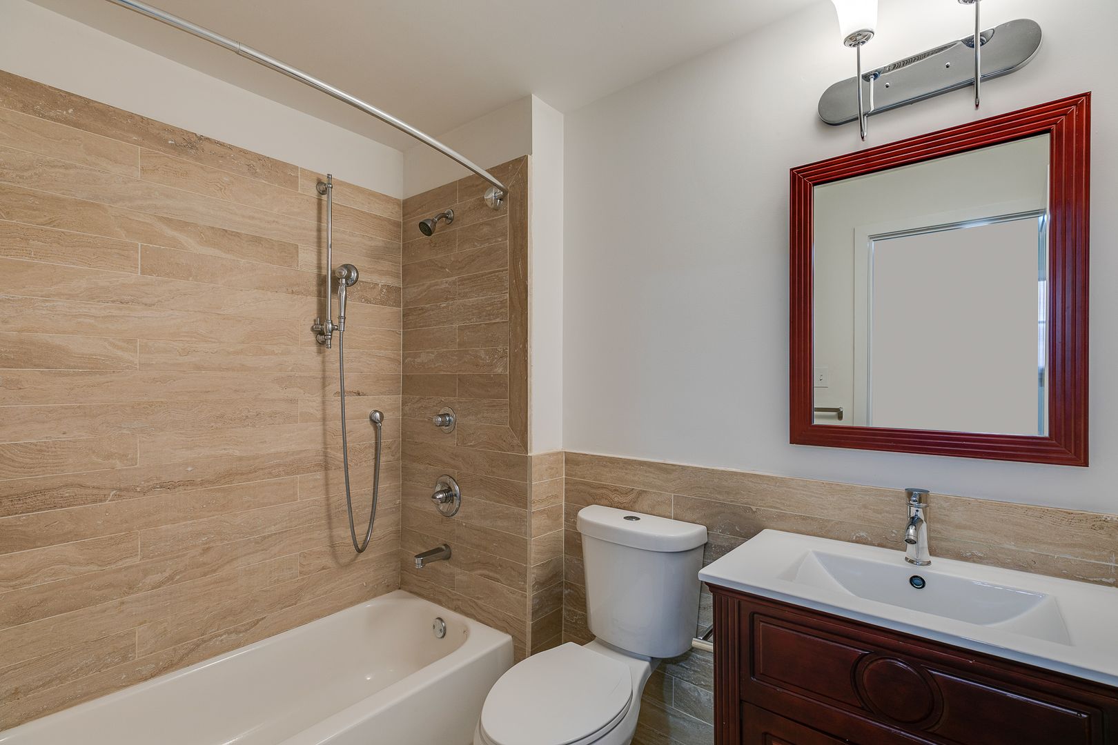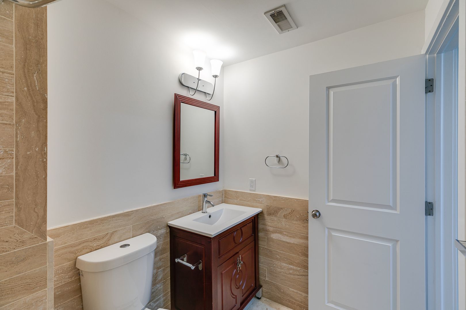 The bathroom is lined with Mediterranean beige-finished tile surrounding a cherry wood-toned vanity to store all of your toiletries. For comfortable living, this unit has a central AC system, an in-unit washer/dryer, as well as a video intercom system to let your guests in and communicate with delivery services.