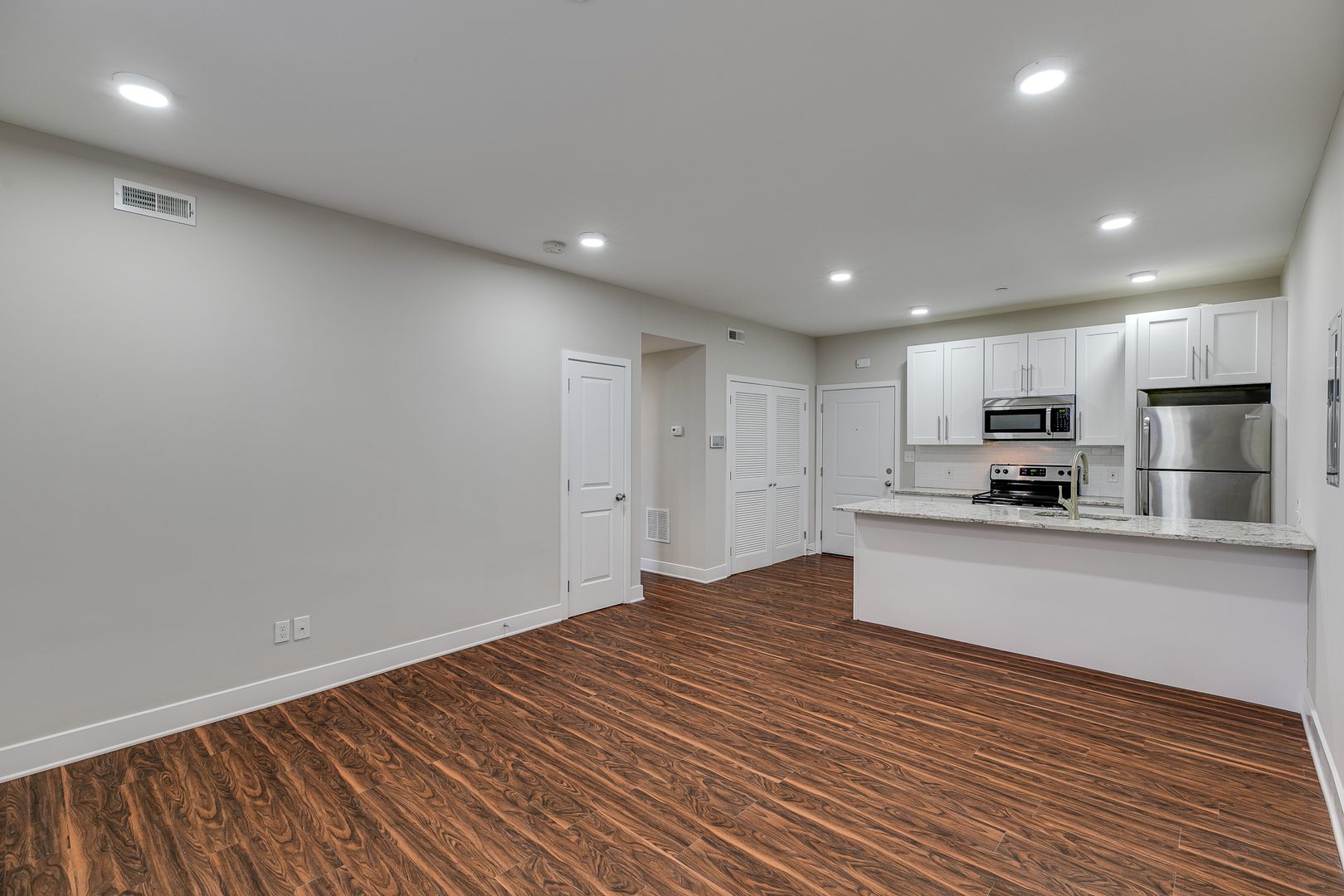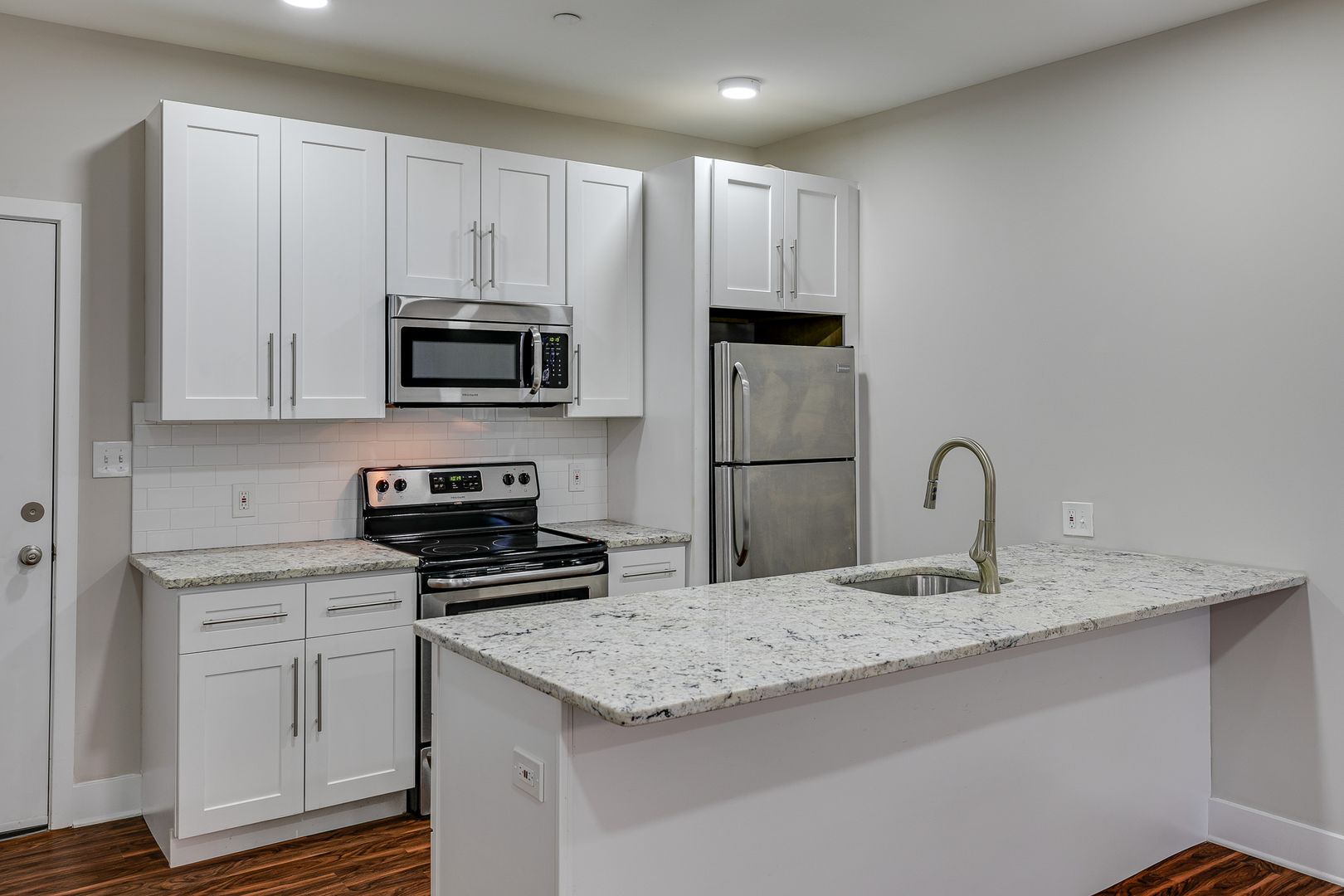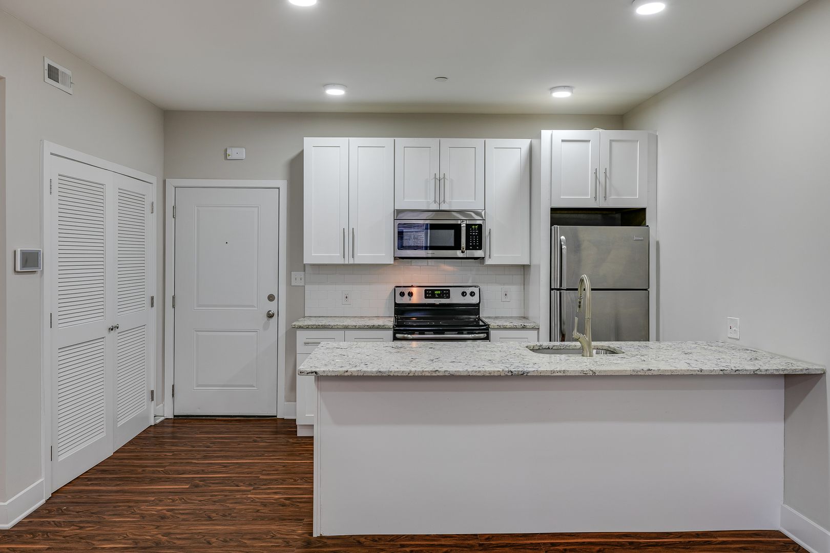 Welcome to 2001 Spring Garden Street Unit 104! Step inside this one-bedroom one-bathroom apartment to be met with an open floor layout featuring an eat-in kitchen with Bethel White granite countertops and stainless-steel appliances lined with white subway tile. These features are further accentuated by high ceilings and salsa wood-toned flooring. The one bedroom provides a walk-in closet as well as ample room for a dresser, nightstand, desk, and any other additional accessories. After dusk, there is no need to reach for your floor lamp as this unit has recessed lighting throughout.