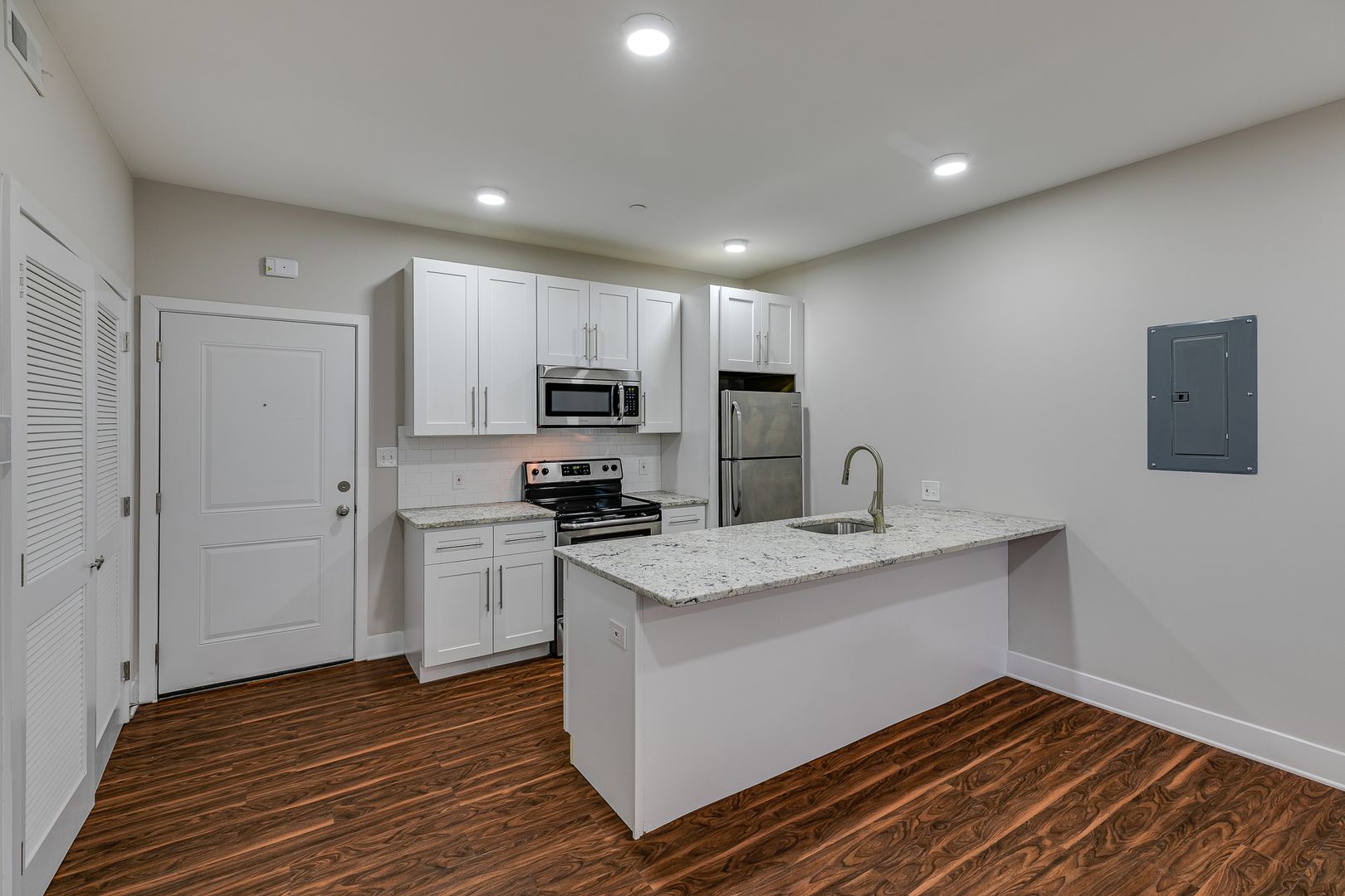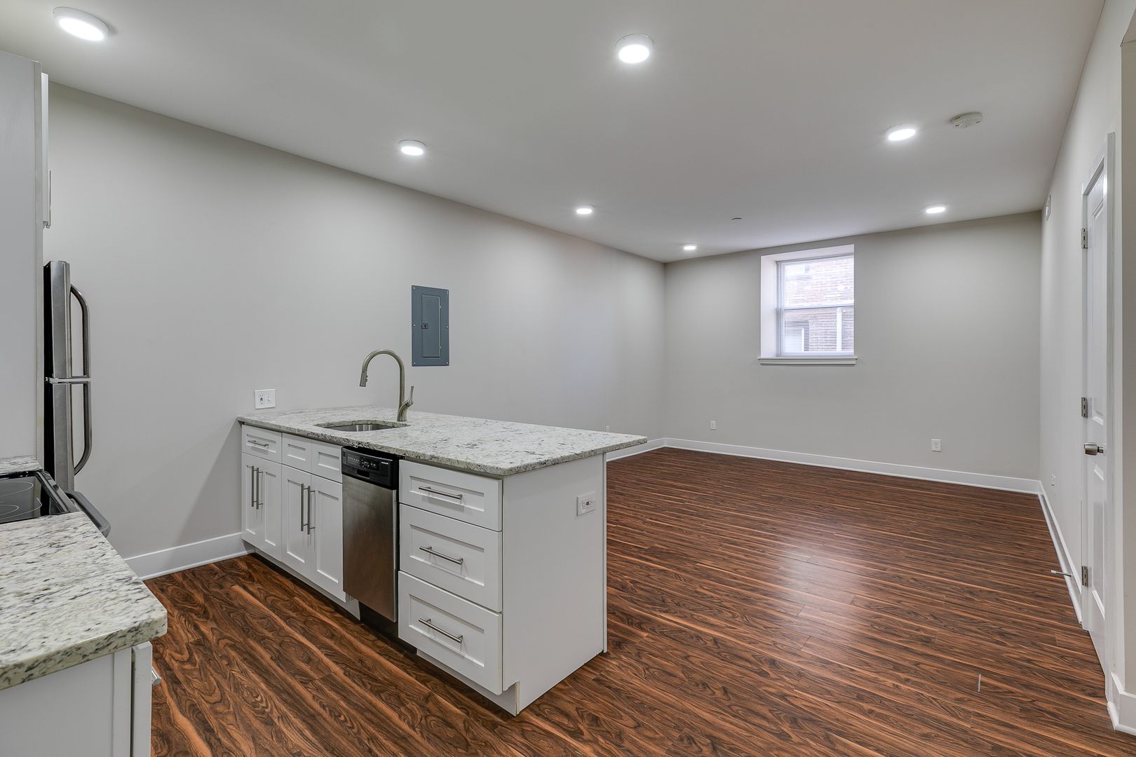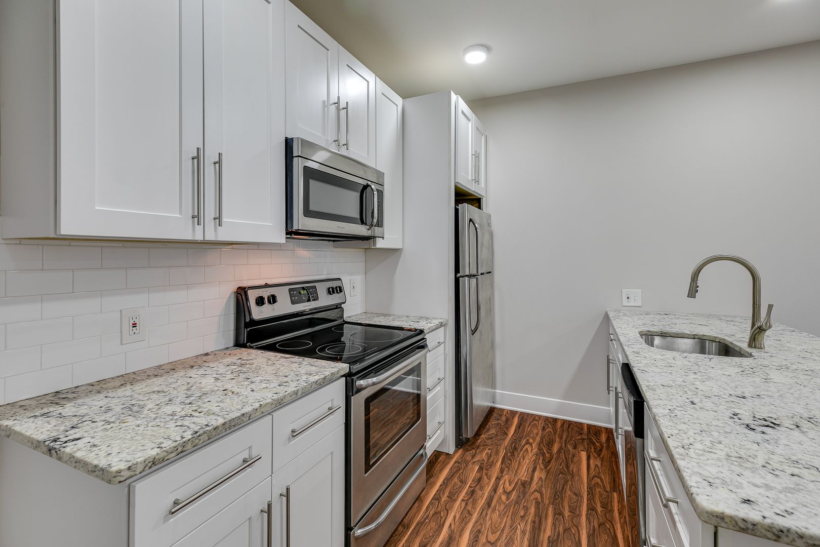 Welcome to 2001 Spring Garden Street Unit 104! Step inside this one-bedroom one-bathroom apartment to be met with an open floor layout featuring an eat-in kitchen with Bethel White granite countertops and stainless-steel appliances lined with white subway tile. These features are further accentuated by high ceilings and salsa wood-toned flooring. The one bedroom provides a walk-in closet as well as ample room for a dresser, nightstand, desk, and any other additional accessories. After dusk, there is no need to reach for your floor lamp as this unit has recessed lighting throughout.